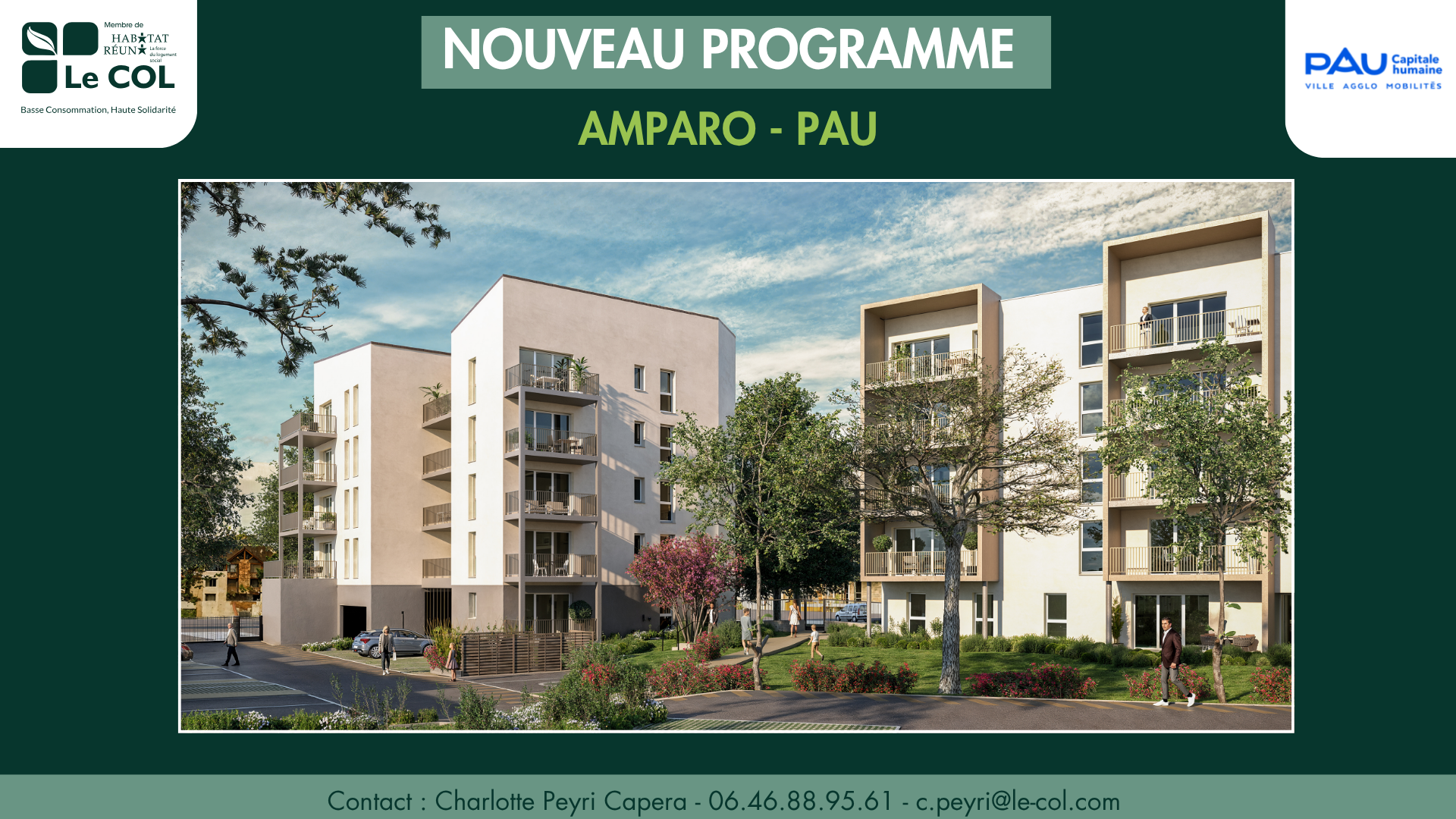 Au cœur du quartier Saragosse, en pleine métamorphose aux portes du centre-ville de Pau, Amparo est le nouveau programme résidentiel du COL. 23 logements — appartements et maisons — conçus pour rendre la propriété accessible à tous, dans un cadre de vie apaisé, végétalisé et tourné vers les mobilités douces.