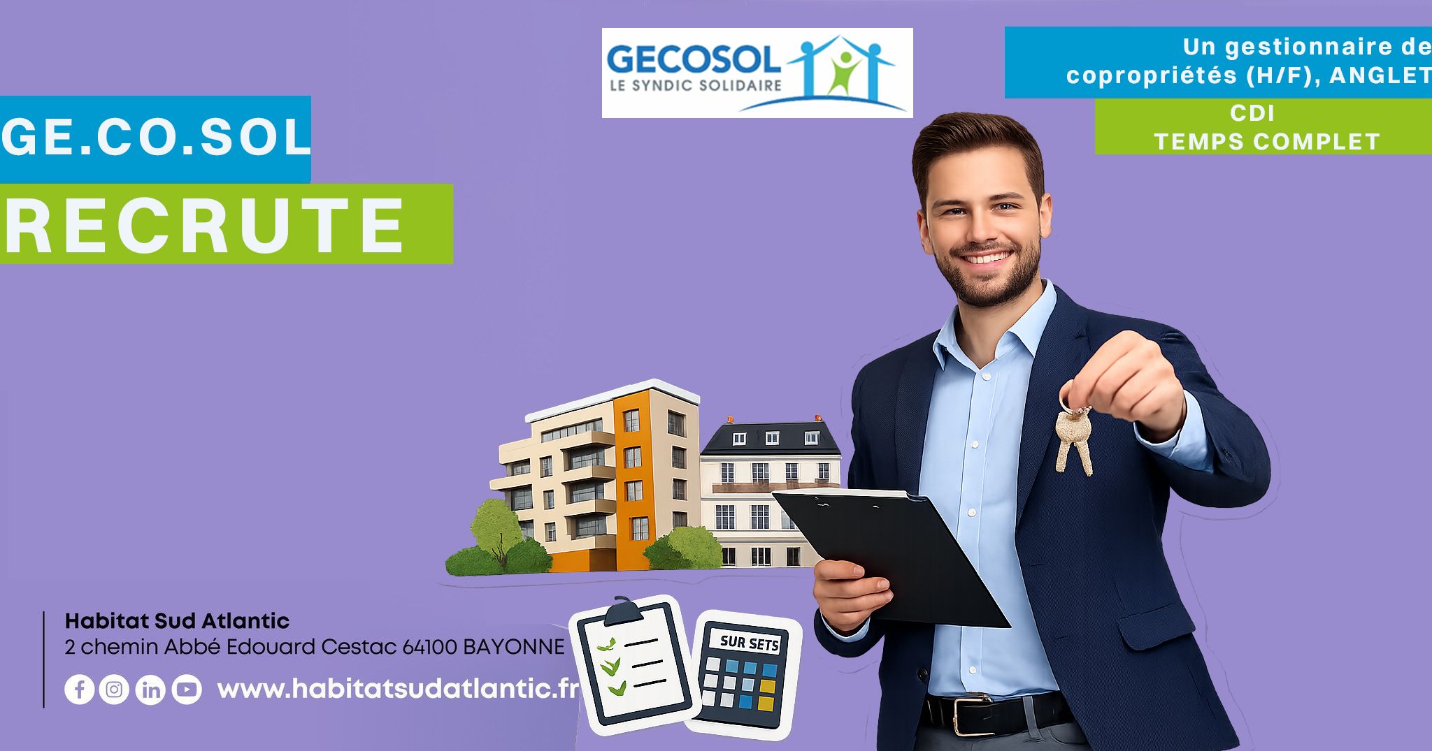 GE.CO.SOL, syndic solidaire, né de la collaboration des bailleurs spéciaux Habitat Sud Atlantic, le COL et l’Office64 de l’Habitat recrute son/sa gestionnaire de copropriétés – poste basé à Anglet